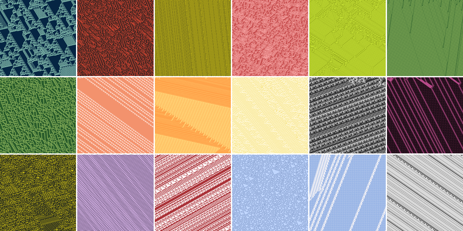 Stephen Wolfram's elementary cellular automata operate on a one-dimensional list of cells, computing future states of cells based on their neighboring cells. Drawing such states in order from top to bottom yields interesting patters, and with some color, they can make for attractive wall art. I wrote a Python script that, based on a design by Reddit user /u/collatz_conjecture, generates cellular automata posters as PDFs.
