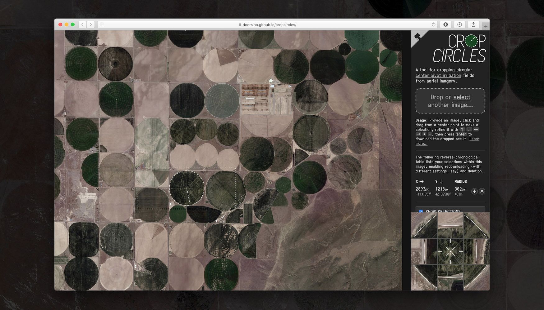 Having previously built a tool for downloading aerial imagery in the form of ærialbot, I found myself drawn to depictions of center pivot irrigation – a method of efficiently watering crops that invariably produces large circles visible on satellite maps. Intending to produce a series of videos, I required some tooling for swiftly and precisely cropping center pivot irrigation fields from aerial imagery, with predefined margins and while keeping associated geotags intact.