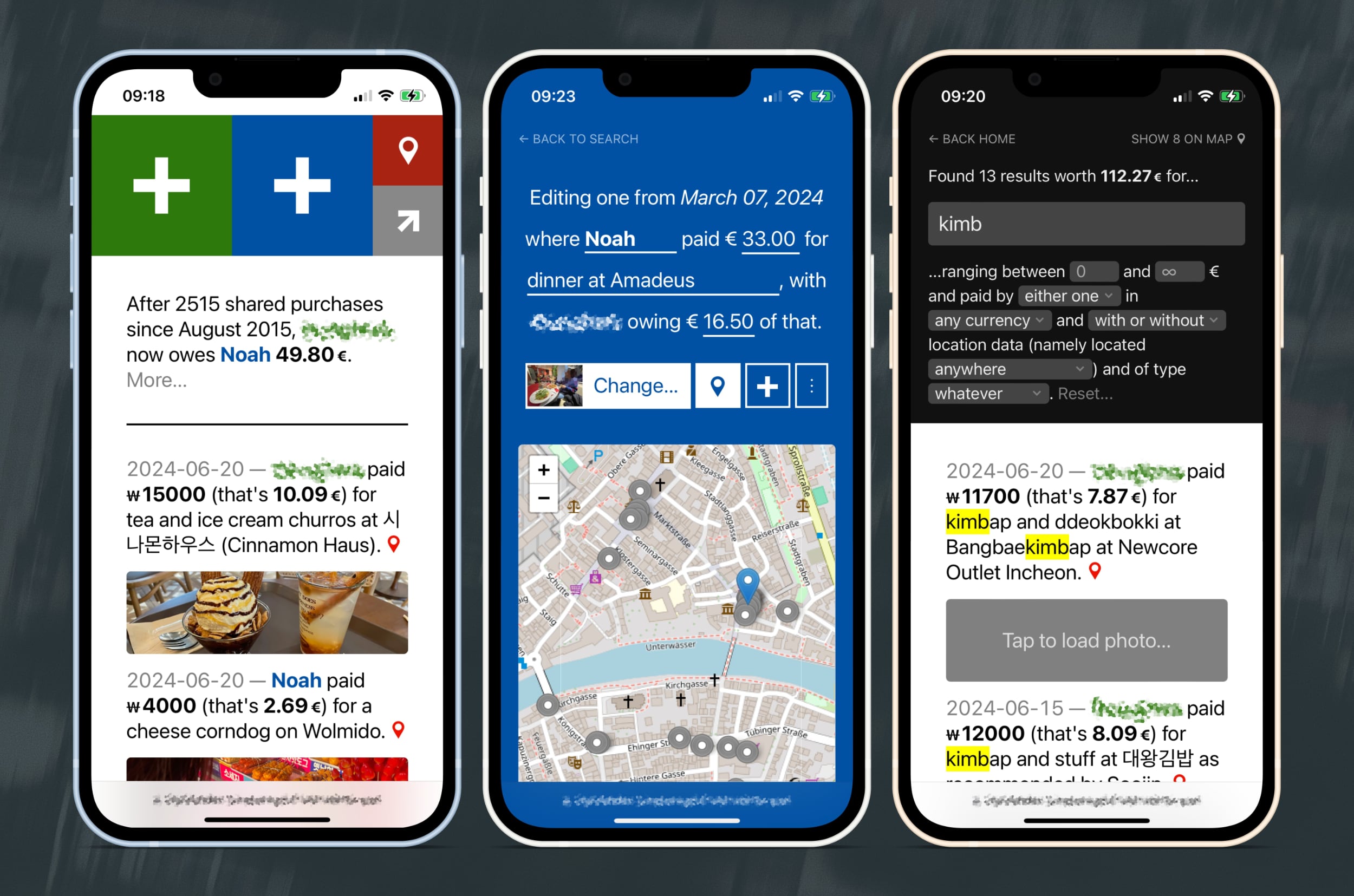 Three screens: the main list of purchases, an edit form, and the search page. There's also a map view and a statistics page, but they're not all that interesting to look at.
