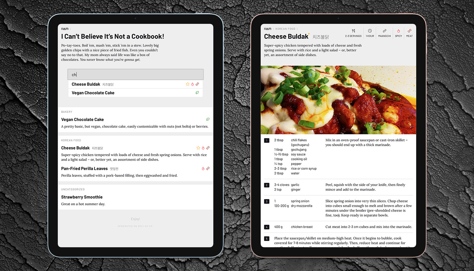 The generated website as it would appear on iPads – the index page (with an active search) on the left and a recipe page on the right. You can check out a demo here.