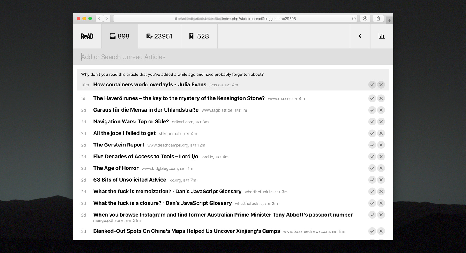 The list of unread articles ReAD presents upon initial load, shown here in a desktop browser. Because I hadn't been diligent about clearing out old stuff from my unread queue at the time the screenshot was taken, a reading suggestion is shown at the top.
