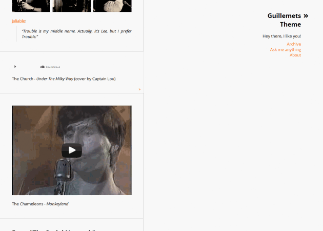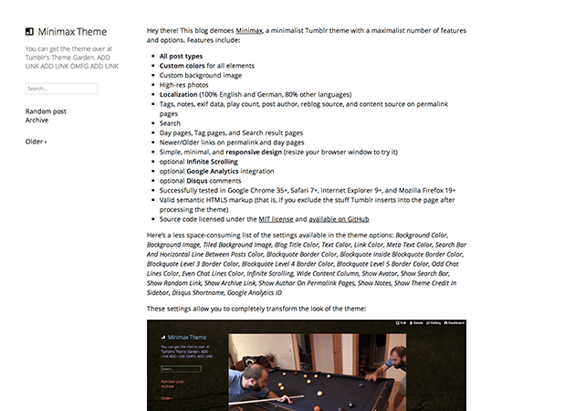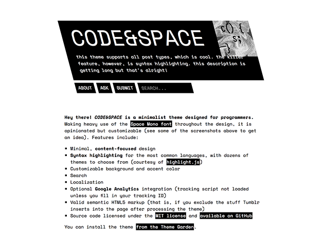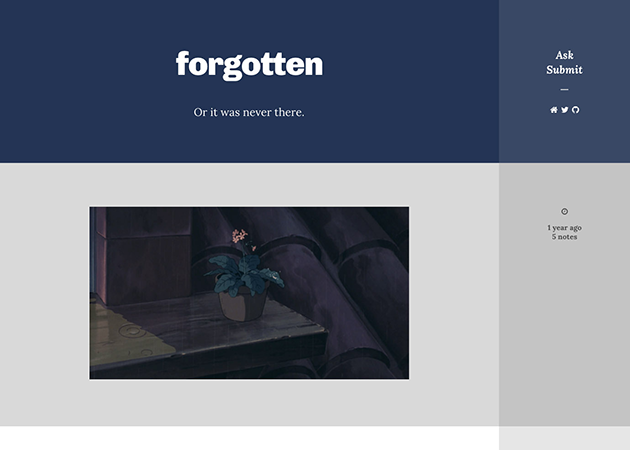 Back in the early 2010s, when the microblogging platform Tumblr hadn't yet gone the way of MySpace, I designed and coded a few themes that users could install on their blogs through the integrated Theme Garden. Collectively, my themes have been installed on thousands of blogs over the years and are still in more-or-less active use on a few hundred.