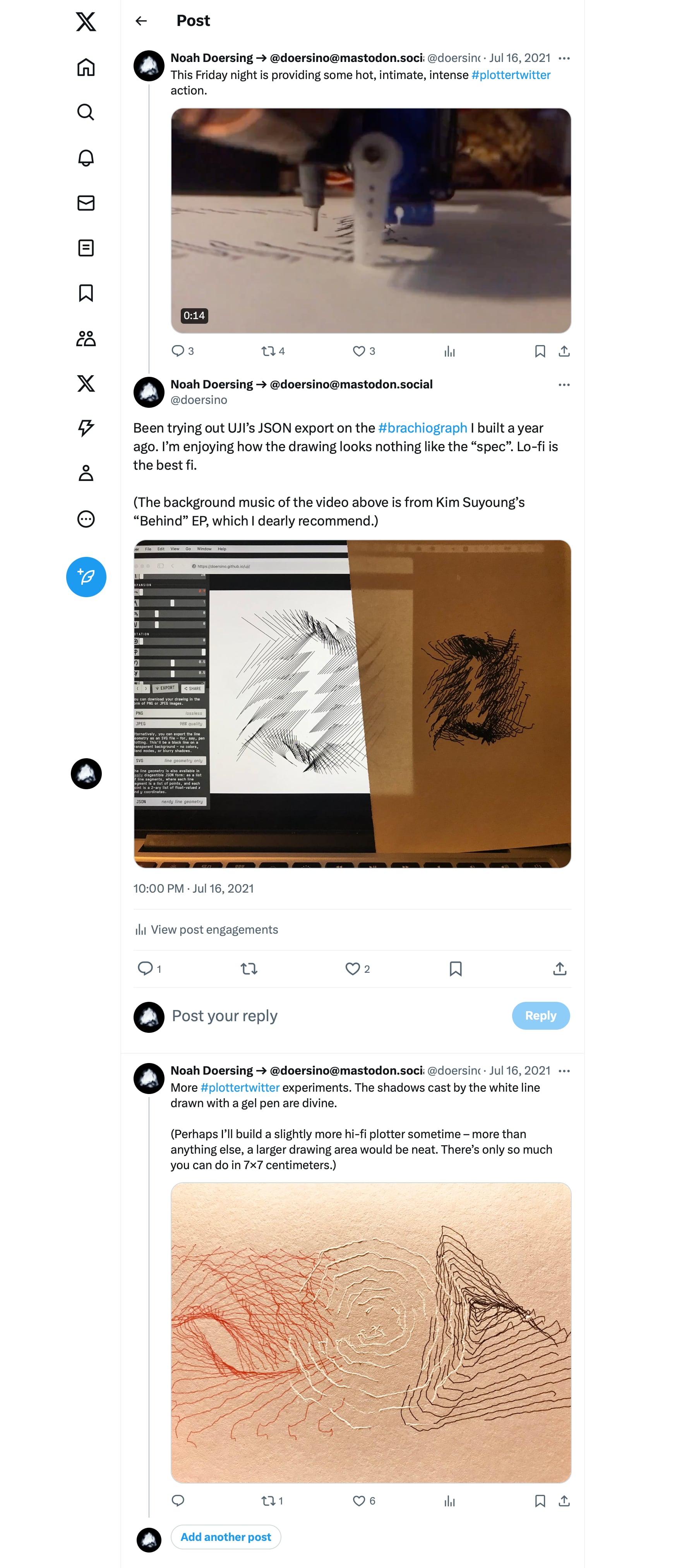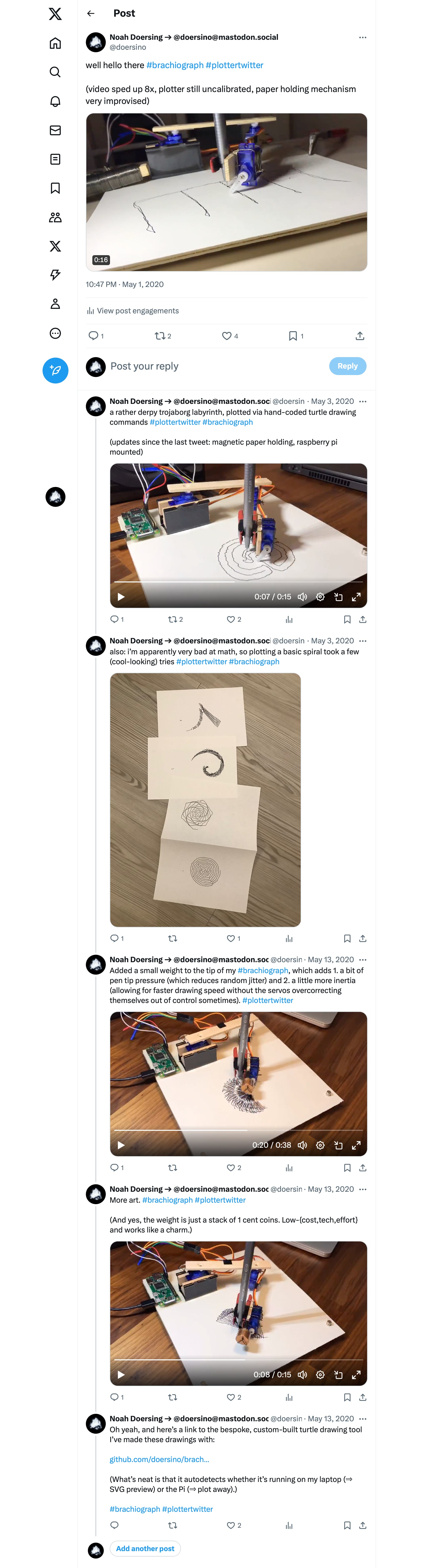 Dubbed Brachiosaurus, this Python-based command-line program 1. emits an SVG preview of the user-defined drawing if running on my laptop or 2. draws it on paper if running on the the Raspberry Pi driving the plotter. What's more, I've documented my escapades on Twitter.