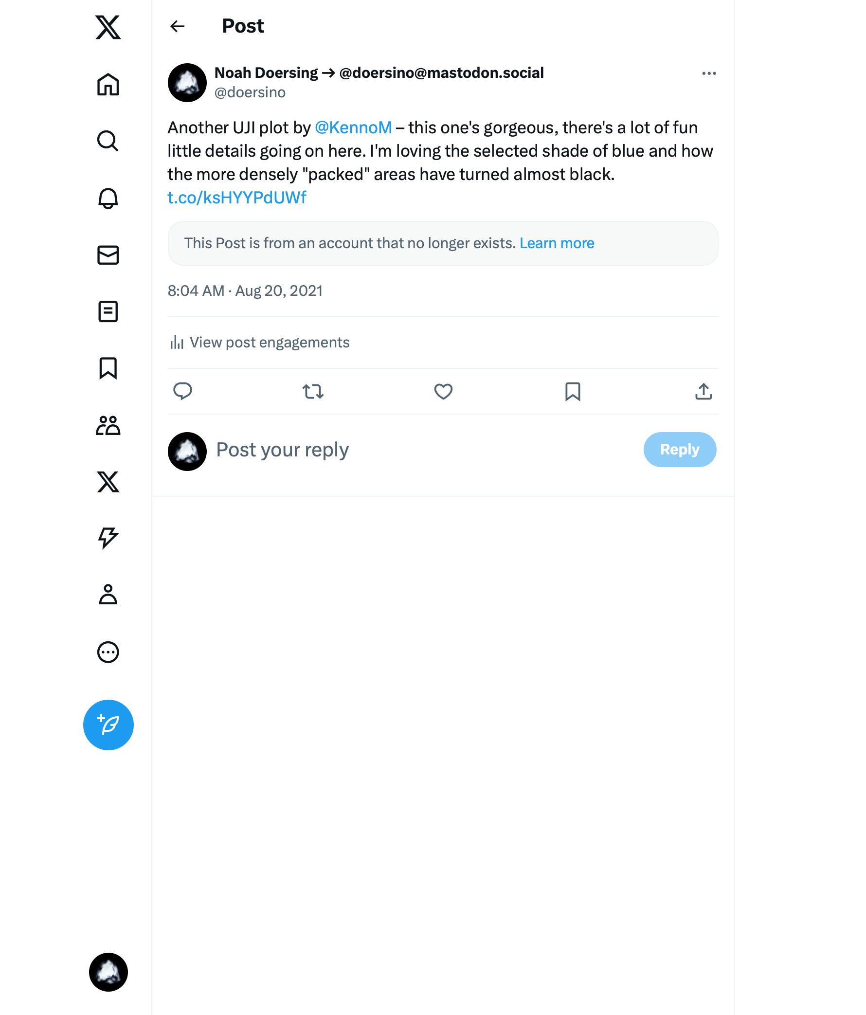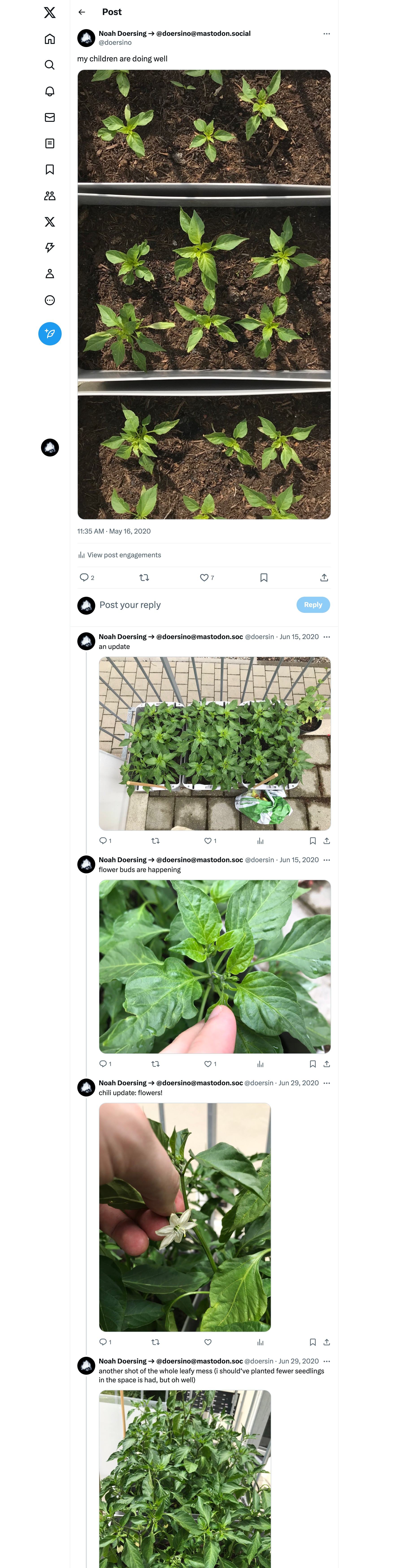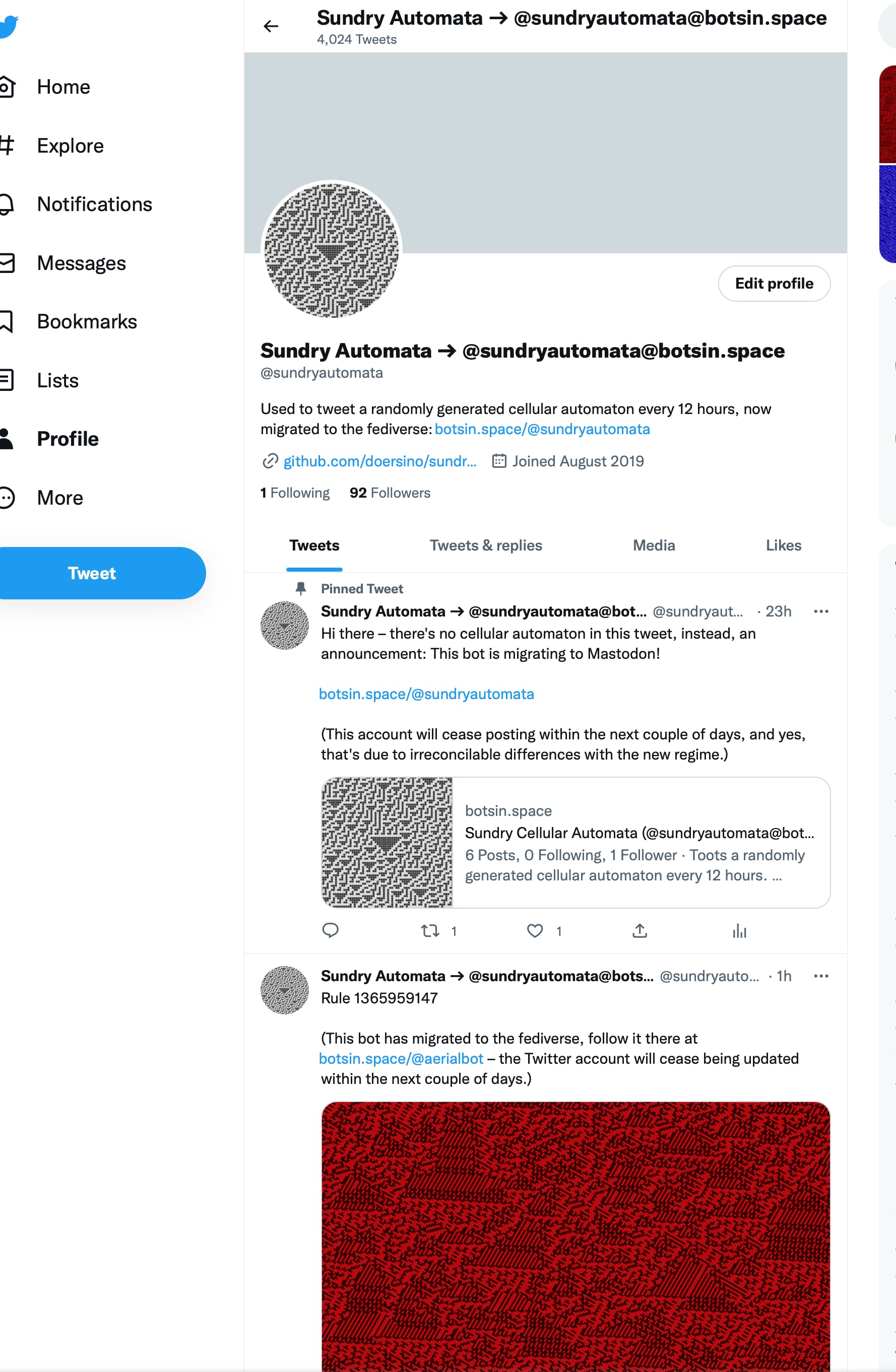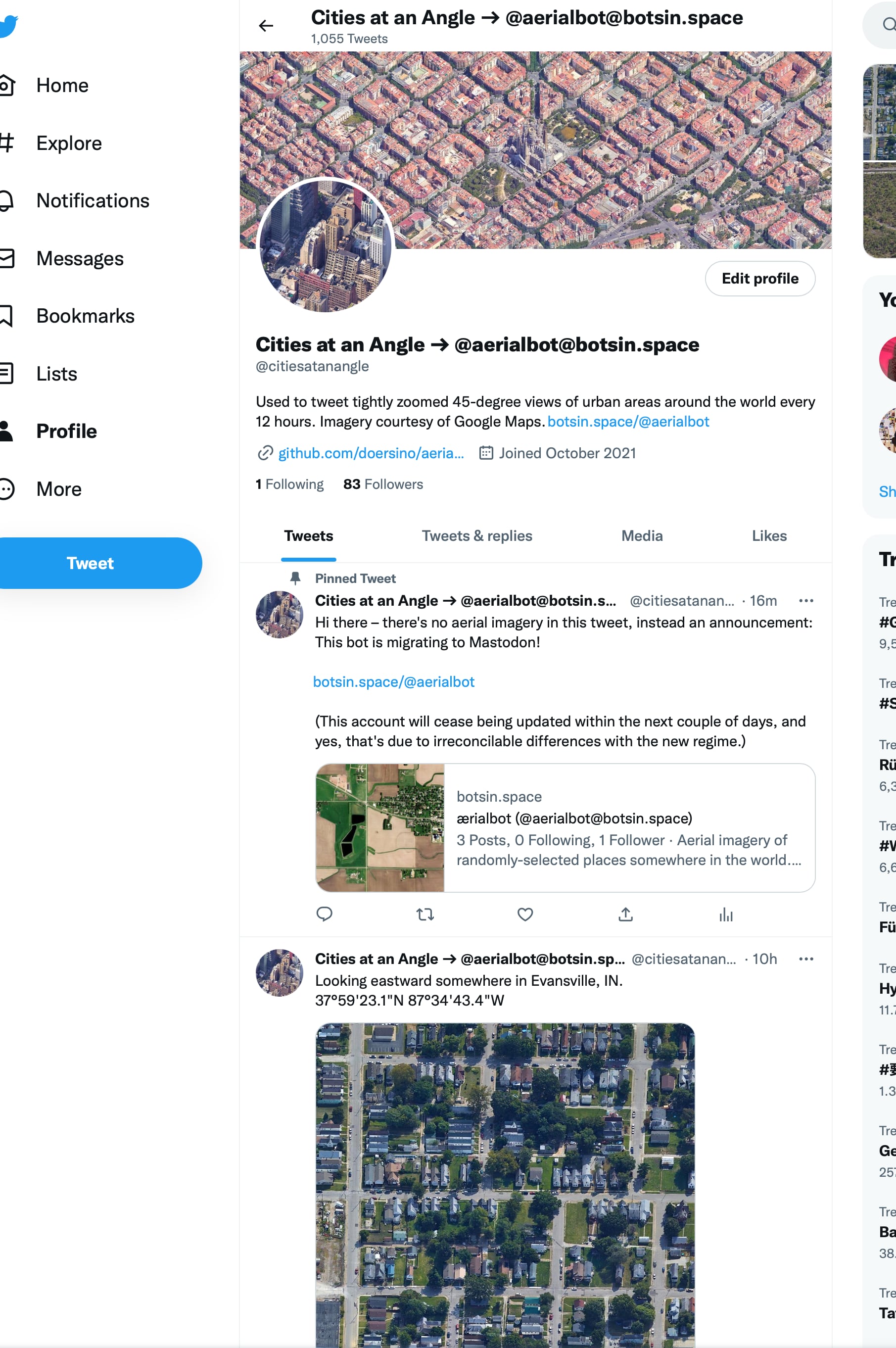 As of late 2022, there were around ~10 active instances of ærialbot – some run by me, the rest by various cool folks – with more than 1000 followers between them. Due to the fallout from Elon Musk's Twitter takeover, none are left there – only @aerialbot@mastodon.social is still active.