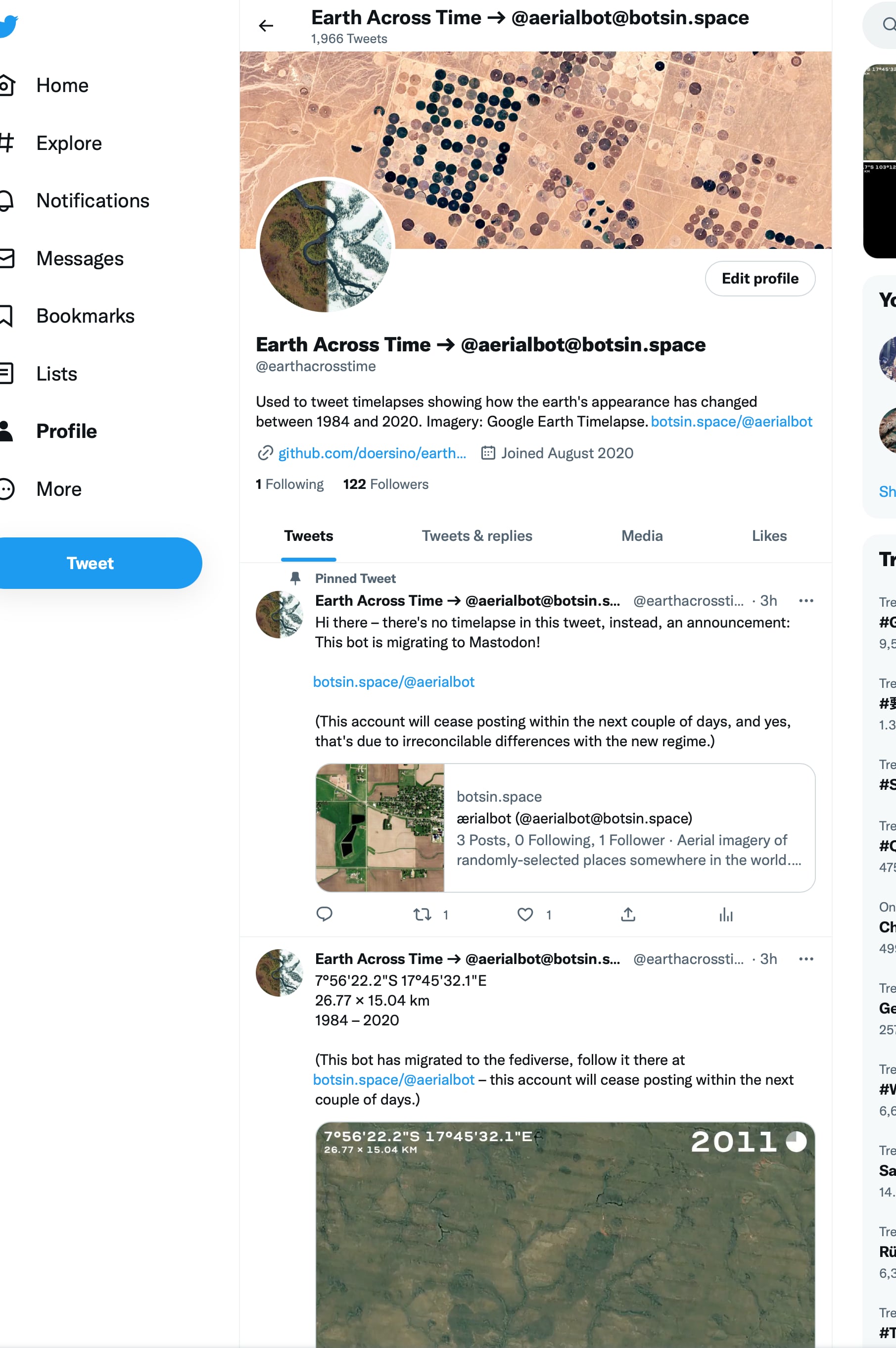 After coming across Google Earth Timelapse, a self-described "global, zoomable video that lets you see how the Earth has changed over the past 34 years" and having previously developed ærialbot (see further up), it seemed only logical to build @earthacrosstime – a Twitter bot that documents how randomly selected parts of the world have changed since 1984. (It's been migrated to Mastodon in late 2022.)