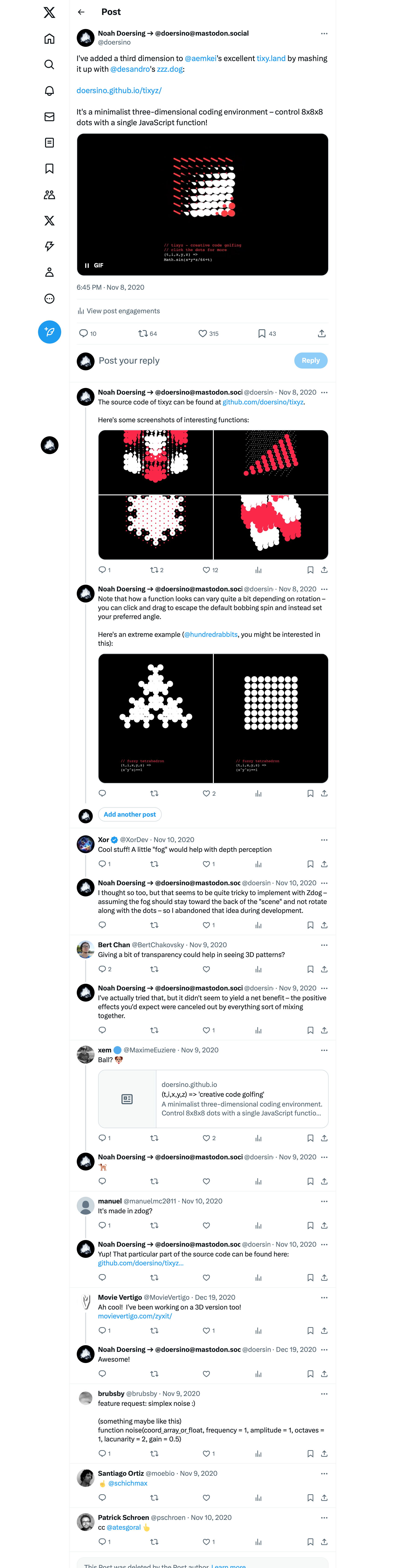 After coming across Martin Kleppe's excellent creative coding environment tixy.land, where you can animate a 16×16 grid of dots using a single JavaScript function, I had the idea of adding a third dimension by mashing it up with David DeSandro's equally-excellent pseudo-3D engine Zdog.