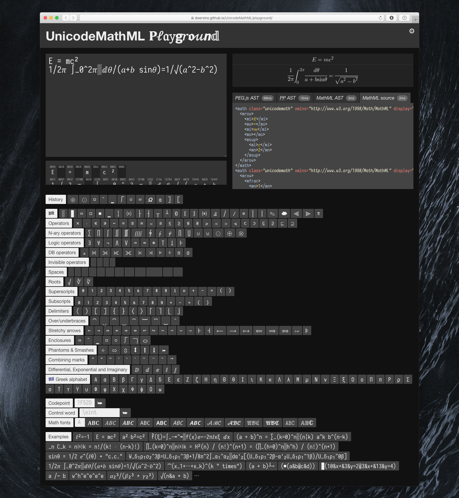 The UnicodeMathML Playground, originally built as a development tool, along with two well-known formulas expressed in UnicodeMath. Get familiar with it here!